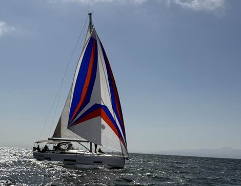 George's sailboat with its new spinnaker in July 2025. Courtesy of George Woolverton